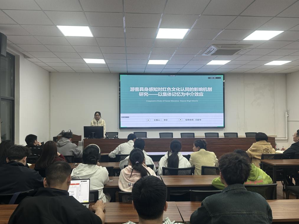 首先,李珍同学以《游客具身感知对红色文化认同的影响机制研究——以集体记忆为中介效应》为题,聚焦红色旅游的文化传承功能。以红旗渠为案例,基于SOR理论、图式理论与社会认同理论,构建了具身感知影响红色文化认同的理论模型,并引入集体记忆作为中介变量。采取问卷调查与结构方程模型分析法研究游客具身感知对红色文化认同影响的问题。随后,黄趁趁同学则围绕《创新驱动政策对城市旅游经济韧性的影响效应及实证检验》展开汇报。针对自然灾害、公共安全事件频发的背景,系统探讨了创新驱动政策对旅游经济韧性的赋能机制。研究通过构建多维指标体系,运用双向固定效应模型、双重差分模型及中介效应模型,从基准回归、稳健性检验、机制检验等六方面展开实证分析。