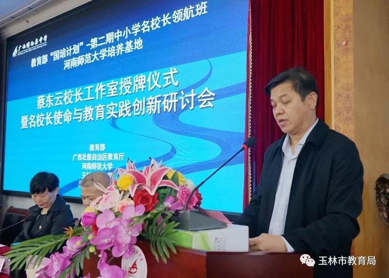 玉林市教育局党组书记、局长蒋以超在致辞中强调,“蔡东云校长工作室”的成立,体现着各级领导对玉林教育和蔡东云校长工作的高度认可与肯定。玉林市教育局将给予高度关注和政策支持,协助蔡东云同志做好工作室的各项工作,借助教育部、优质的教育资源,加快推进教育强市建设,奋力谱写新时代玉林教育发展新篇章。