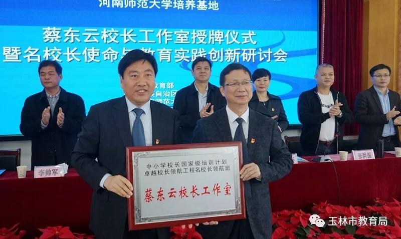 12月26日上午,教育部第二期中小学名校长领航工程“蔡东云校长工作室”授牌暨教育实践创新研讨会在玉林市博白县中学隆重举行。教育部“国培计划”首席专家、党委副书记、博士、二级教授陈广文,教育学院党委书记、教授李帅军,河南省教师发展评估院院长肖广军,郑州七中校长王保军,玉林市教育局党组书记、局长蒋以超,市教育局党组成员、副局长张洪振,博白县委常委、宣传部部长、副县长梁燕,博白县教育局党组书记、局长黄立富和蔡东云校长工作室成员、申报“玉林市中小学名校长工作室”的部分主持人及成员、博白县各高、初中校长共约280人参加活动。