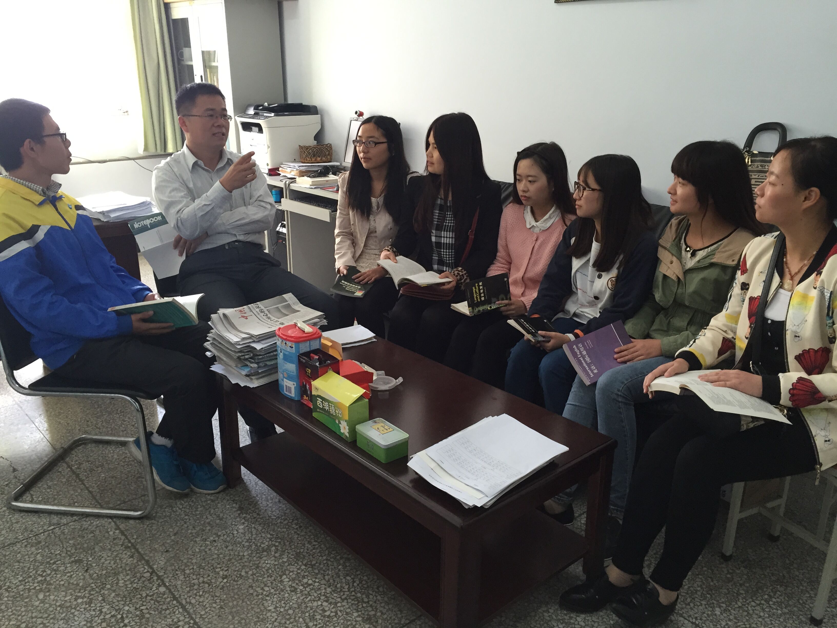 阳光透过窗户洒在学生们专注的脸庞上。他们时而低头沉思,时而抬头与组员热情讨论。刘国兵穿梭于各小组之间,时而倾听学生们的讨论,时而给予他们宝贵的指导和建议。当某个小组提出一个新颖的观点时,他便会露出赞许的微笑,并鼓励他们在全班面前分享这份独特的见解。坐在教室中间的张瑞(2017级英语专业本科生,2021年考入外国语言文学专业攻读硕士研究生,2024年考入广东外语外贸大学攻读博士学位),紧握着笔,目光时而落在课本上,时而偷偷瞄向那些自信发言的同学,心中充满了羡慕却又带着一丝胆怯。大学二年级的她,英语口语并不流利,每当想要举手时,那份对自我表达的恐惧就会让她的手悄悄放下。