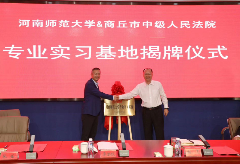 会上,秦法跃与杨飞共同签署《专业实习基地建设协议书》,法学院党委书记张壬和陈晓辉共同签署《与商丘市中级人民法院卓越法治人才联合培养合作框架协议》,秦法跃与杨飞共同为“专业实习基地”揭牌。