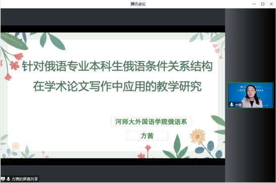 为促进学院内部学术交流,加速经验传递和增进学院教师学术水平,1116日,外国语学院青年教师博士论坛系列讲座第三讲如期举行。学院新引进教师方茜博士在线作了题为“针对俄语专业本科生在学术论文写作中应用俄语条件关系结构的教学研究”的学术讲座。百余名校內师生及省内外部分兄弟院校师生参会聆听。讲座由新引进教师贾淑月博士主持。