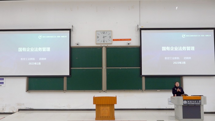 为加强学生对企业法律顾问的认识和了解,2023年2月28日法学院邀请新乡市航空工业(集团)有限公司纪检审计法律部副部长武晓琳,讲授《国有企业法务管理》一课。