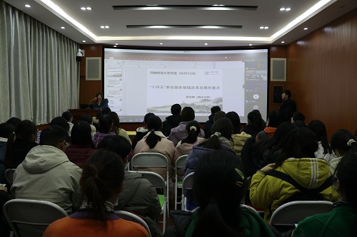 讲座由校统战部副部长张晨寒主持。何文炯从“现实矛盾”、“若干问题讨论”、“改革发展重点”三个方面进行讲解。他以我国养老服务现况为切入点,分析当前我国养老服务领域存在的现实矛盾。同时,并结合专业理论讨论了“养老服务与老年保障”“权责清晰与多元共治”“市场规律与供给机制”三个重要问题。讲座最后,结合中共十九届五中全会精神,他着重阐述了“十四五”时期养老服务领域改革发展的重点,他强调未来要扩大养老服务供给,增加养老服务有效需求,规划养老服务行业,创新养老服务组织运行机制。
