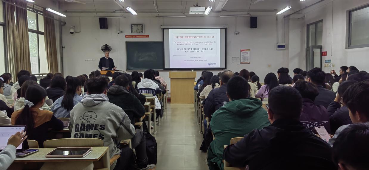 本次讲座的主题为《西方插图中的中国制度、经济和社会(约1700-1840年)》Visual Representations of China.Institutions, Society, and Nature in Western Illustrated Literature (c. 1700-1840)。讲座期间,阿巴蒂斯塔教授聚焦1700至1840年间西方插图文献,梳理了这一时期西方对中国形象的视觉建构过程。他指出,早期西方对中国的插图呈现多由耶稣会士主导,带有理想化色彩,如1697年,Bouvet的《中国现状图册》对清廷礼制与帝王形象的刻画;18世纪后,随着中西交流增多,插图主题逐渐拓展至农业生产、手工业场景、劳动大众等社会经济领域;19世纪初马戛尔尼使团访华后,普通民众生活、司法场景等内容进一步进入西方视野,反映出西方对中国的认知从“文化仰慕”向“现实审视”的转变。圭多教授还简要分享了其研究团队对2304幅相关插图的整理成果,强调这些插图虽受创作意图与传播语境影响,却仍是还原近代中西文化交流的重要史料。