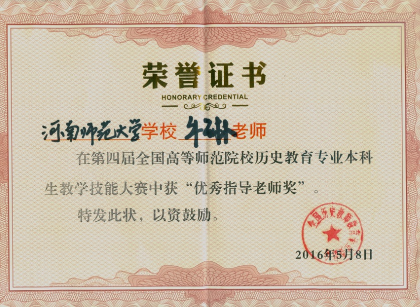 近日,河南省教育厅发布“关于公布第十三届高等学校师范教育专业毕业生教学技能大赛结果的通知”,2015年11月13日—15日,河南省第十三届高等学校师范教育专业毕业生教学技能大赛在郑州师范学院顺利举行,经过激烈角逐,我院牛琳老师指导的2013级历史学专业魏湄馨同学,获得初中历史组一等奖,魏星同学获初中历史组三等奖,牛琳老师获优秀辅导奖,我校获团体二等奖。以上师生的获奖,为我校争得了荣誉,也是我院近年