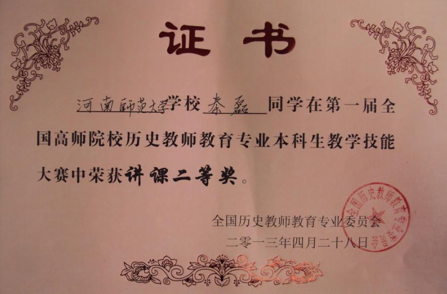 2013年4月26—28日,“第一届全国高师院校历史教师教育专业本科生教学技能大赛”在上海师范大学举行,此次大赛共设说课一等奖12个,讲课一等奖6个。我校历史文化学院获得一个一等奖、两个二等奖的优异成绩,其中2009级历史学专业的王梦竹同学获得说课一等奖,张晓迪同学获得说课二等奖,秦磊同学获得讲课二等奖,我校获得优秀组织奖。