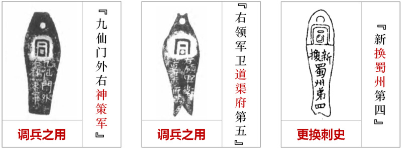 通常左符藏于京师,右符发给诸如督守京城的长官、军府、小型驻边军队、驻军机构、掌管皇帝禁卫的亲军等机构的长官。数量上左符不固定,发于外边的右符只有一个,通常是“左三右一”或“左五右一”,有诏令的时候取出左符,将左符与其外的右符合并勘验,勘验无误则允许发兵或任命、罢黜地方官员;勘合无误而不及时发兵,或左右符不相合,还会面临严格的处罚。这样也就在一定程度上避免了军官私下调动军队或用一个兵符调动两个地方军队之类叛乱的发生。例如,下图鱼符刻“九仙门外右神策军”,九仙门是唐代大明宫西面的城门,神策军是唐朝中后期中央北衙禁军的主要武装力量,所以这件鱼符就是朝廷派发给负责九仙门外的神策军长官,并作调兵之用的右符。除此之外,还有“右领军卫道渠府第五”和“新换蜀州第四”,分别是朝廷所存用于调遣道渠府府兵的第五枚左符,以及更易蜀州刺史时所用的第四枚左符。