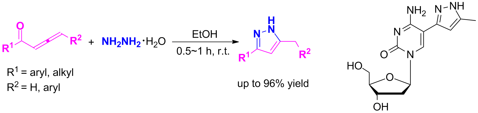 6. Shenghai Guo*, Jiliang Wang, Dongqiang Guo, Xinying Zhang, and Xuesen Fan*. Synthesis of 3,5- disubstituted pyrazoles via cyclocondensation of 1,2-allenic ketones with hydrazines: application to the synthesis of 5-(5-methyl-pyrazol-3-yl)-2'-deoxycytidine. RSC Adv., 2012, 2(9), 3772-3777.