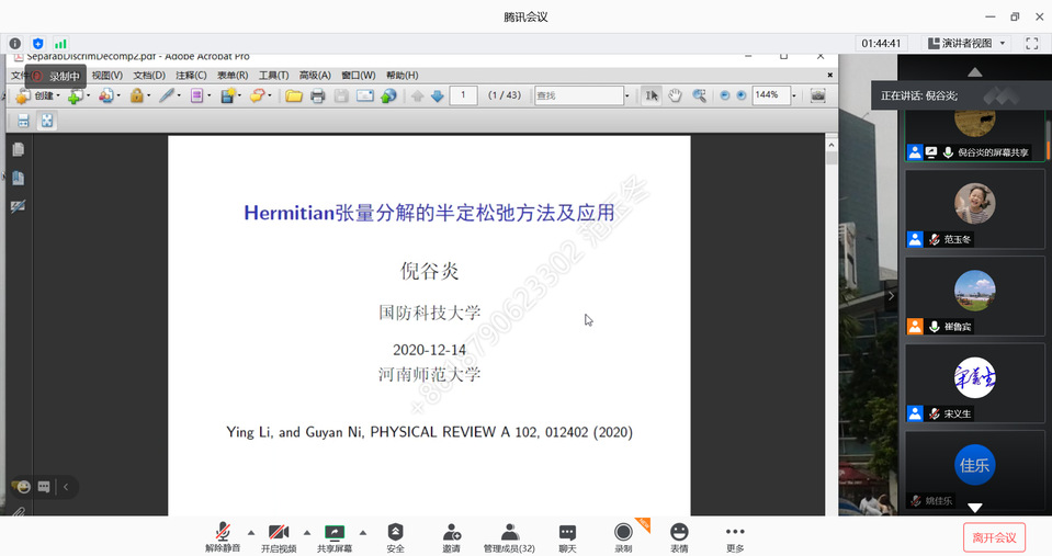 12月14日,应数学与信息科学学院的邀请,国防科技大学倪谷炎教授在线上会议为我院师生作了“Hermitian张量分解的半定松弛方法及应用”的学术会议。的相关专业教师、研究生、本科生等共三十余人参加了线上会议。会议由数学与信息科学学院崔鲁宾老师主持。