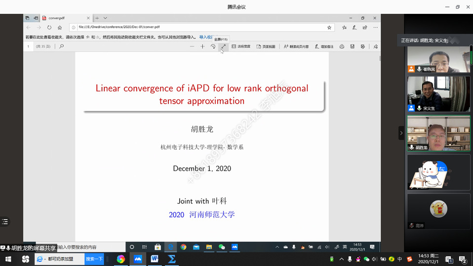 12月1日,应数学与信息科学学院的邀请,杭州电子科技大学胡胜龙教授、喻高航教授在线上会议为我院师生分别作了“Linear Convergence of an Alternating Polar Decomposition Method for Low Rank Orthogonal Tensor Approximations”与“高阶马尔科夫链:模型、算法及其应用”的学术会议。的相关专业教师、研究生、本科生等共30余人参加了线上会议。会议由数学与信息科学学院宋义生、崔鲁宾老师主持。