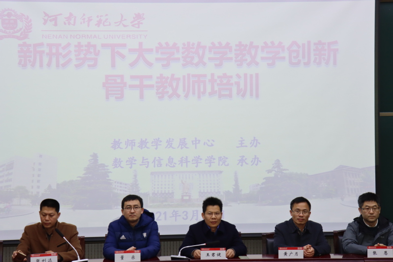 3月20日上午,由教师教学发展中心主办、数学与信息科学学院承办的教育部网络培训中心“新形势下大学数学教学创新骨干教师直播培训”分会场活动在数学与信息科学学院报告厅举行。教师教学发展中心主任王君健、副主任张利远、数学与信息科学学院副院长黄广月、董乐、计算机与信息工程学院副院长张恩、大学数学相关课程教师参加开班仪式。会议由张利远主持。