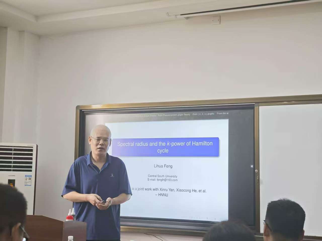 7月13日,应数学与统计学院的邀请,中南大学博士生导师冯立华教授为学院师生作题为“Spectral radius and the power of Hamilton cycle”的学术报告,相关专业教师和硕士研究生参加了此次报告。 冯立华教授首先从经典图论中的Dirac定理入手,引出Posá-Seymour猜想:如果一个连通图G满足最小度大于等于kn/(k+1),那么G包含一个C^n_k。然后,从随机和伪随机的角度介绍了相关的概念、结果及感兴趣的问题,最后提出H-free图的最大谱半径是多少的问题,讲述了其关于H=C^n_k的相关结果和最新进展。 冯立华教授的报告深入浅出,与会师生受益匪浅。报告结束后,冯立华教授对师生提出的相关问题进行了细致地解答。本次报告会内容丰富,讨论热烈,加深了学科之间的交流。 专家简介: 冯立华,博士,教授,博士生导师,于上海交通大学获得博士学位。主要关注图论,代数图论等相关问题。目前为湖南省数学会理事,中国工业与应用数学学会图论组合分会理事等。目前发表论文100多篇,Math Review显示被引用多次。曾主持基金多项。目前致力于特征值方法在极值图论里面的应用以及代数方法在图谱理论中的应用。 (数学与统计学院 赵潇) |