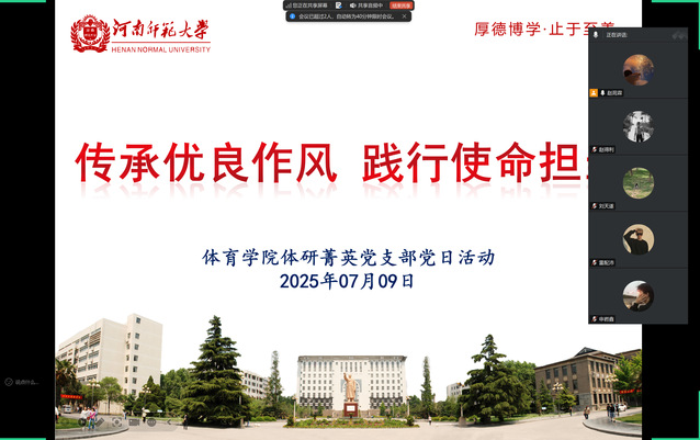 为传承党的优良作风,增强党员的使命担当意识,7月9日下午,体研菁英党支部以线上会议形式开展了“传承优良作风 践行使命担当”主题党日活动。本次活动由党支部书记赵苑霖主持,全体党员参加,旨在通过线上VR展厅走进中国人民抗日战争纪念馆,重温革命历史,汲取奋进力量。