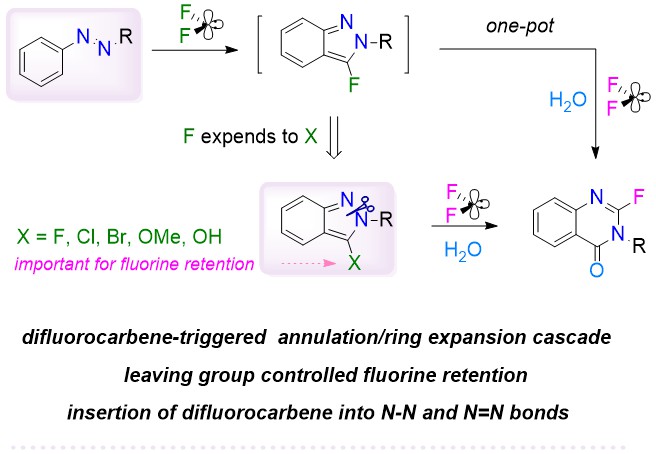近日,药学院(平原实验室)刘丙贤副教授在国际学术期刊Chemical Science上发表了题为A Difluorocarbene-triggered Annulation/Ring Expansion Cascade via Sequential Single-atom-insertions: Direct Assembly of 2-Fluoroquinazolinones from Azo Compounds的研究论文。该研究成功开发了一种二氟卡宾介导的环化/扩环串联策略,实现了从偶氮化合物到2-氟喹唑啉-4(3H)-酮类化合物的直接转化,攻克了喹唑啉酮骨架氟原子定向引入的难题,为药物分子后期骨架修饰提供了高效的新工具。