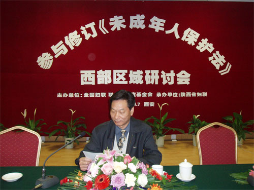 2006年4月7日至9日,由全国妇联、联合国儿童基金会主办,陕西省妇联承办的参与修订《未成年人保护法》西部区域研讨会在陕西省妇女儿童活动中心召开。与会人员有来自陕西、湖南、河南、山西、宁夏、青海、甘肃、湖北等省区妇联及教育、法律、社会工作等方面的专家代表共40余人,专家们就如何在新形势下保障未成年人的合法权益等问题进行了热烈讨论,并针对未成年人保护方面发生的新变化、新情况,提出了希望和要求。我校青少年研究中心主任高中建教授作为河南省参与修法专家小组成员被邀参加此会并作了主题发言。与会的另外两名同志分别是省妇联儿童部部长张宇辉同志和省高院少年法庭的宋红霞同志。