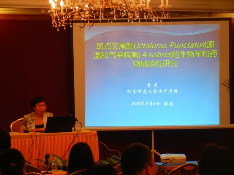 11月5-8日,中国水产学会鱼病学专业委员会2013年学术讨论会在海口举行。本次会议由中国水产学会鱼病专业委员会主办,海南大学海洋学院、中国科学院水生生物研究所、国家大宗淡水鱼类产业技术体系病害防控功能研究室承办。来自中国科学院、中国水产科学研究院、中山大学、等科研院所的450余名代表与会。我院副院长孔祥会教授带领学院教师李莉副教授、狄桂兰博士、祝国荣博士、张超博士参加了本次学术研讨会。
