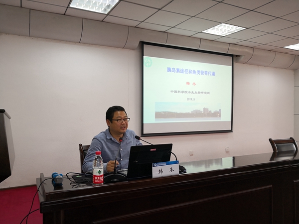 韩冬研究员首先作了题为“胰岛素途径和鱼类营养代谢”的学术报告,他从不同食性鱼类对饲料糖的利用引出科学问题,分别阐述了“两种不同亚型的胰岛素受体基因分别及同时缺失对斑马鱼早期发育的影响”及“高糖饲喂条件下两种不同亚型的胰岛素受体基因分别缺失对斑马鱼营养代谢的影响”。随后,与会的各位师生就有鱼类糖代谢机制、相关实验技术等相关问题与韩冬研究员进行了交流。