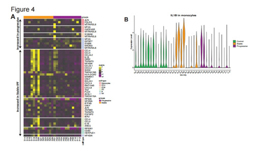 与对照组相比,IPF(稳定期和进展期患者)的基因表达变化如图3所示。作者发现了IPF患者明显存在异常的髓系特征,S100A8和S100A12增加,而HLAII型转录本减少(图3A-B)。