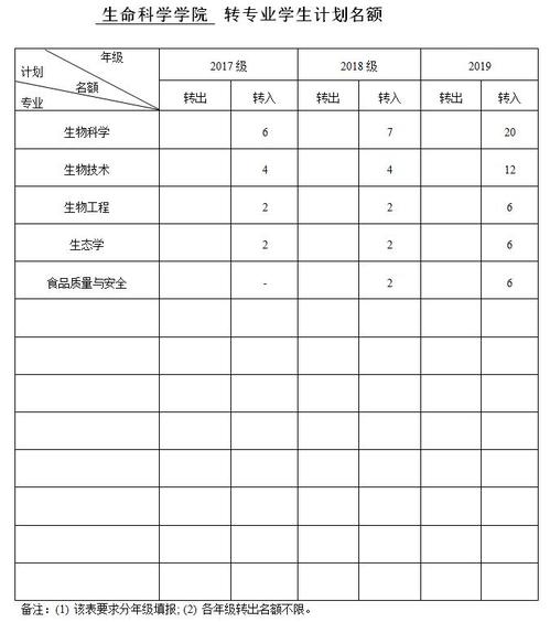 依据生命科学学院各专业师资力量、招生计划、教学条件、学生就业前景等实际情况,制定拟转出和接收转专业学生计划名额(见附件二)。
