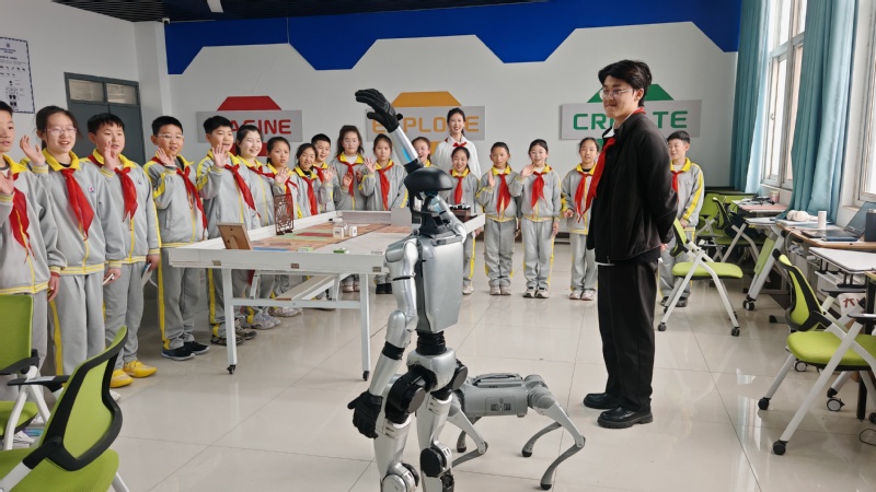 最让同学们兴奋的当属互动实践环节,大家分组上阵、亲自动手,化身“小小科技体验官”,在实操中感受科技的神奇魔力。在编程调试区,同学们通过简单易懂的拖拽式编程模块,亲手为智能小车设定行进路线,看着自己指挥小车的顺畅行驶,眼中满是惊喜;在机械臂操作区,同学们小心翼翼地操控手柄,指挥机械爪精准完成抓取、搬运、放置物品的任务,每一次成功操作都让孩子们成就感满满;在人形机器人展示区,部分同学大胆尝试输入简单动作指令,亲眼见证一行行代码转化为机器人整齐灵动的舞蹈动作,奇妙的科技体验引得现场阵阵欢呼与掌声。整个互动过程气氛热烈、秩序井然,孩子们眼中闪烁着对科学知识的好奇与渴望,尽情享受着动手实践、探索创新的乐趣。