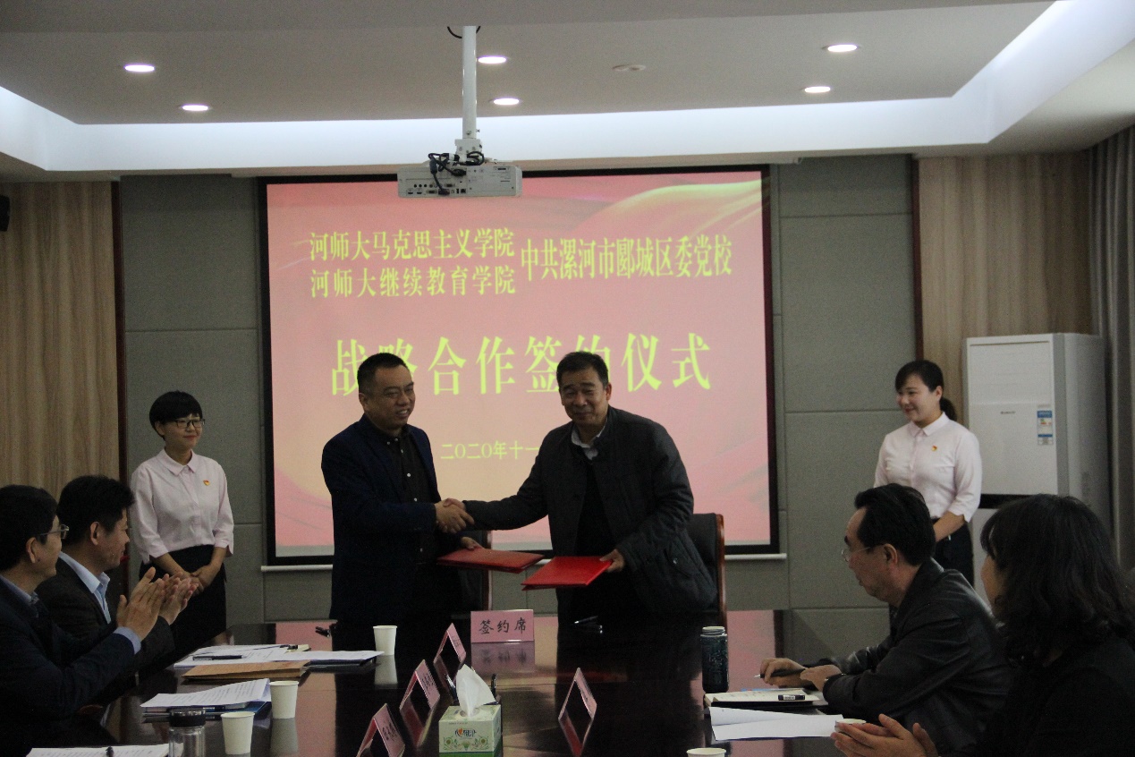 11月13日上午,我院与郾城区委党校战略合作签约仪式在郾城区委举行。院长蒋占峰、继续教育学院院长李津、我校专家代表及漯河市政协副主席、郾城区委书记周新民,郾城区委常委、组织部部长李伟恒,漯河市委党校党委委员、副校长田永林等出席会议。