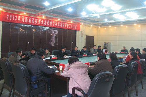 2月28日上午,2013年河南省高校师生思想政治状况滚动调查工作会议在我校勤政楼第三会议室召开。校党委副书记王海旺出席会议并讲话。来自我校以及郑州大学、河南大学等13所高校的党委宣传部部长和学工部(处)长参加了会议。会议由教育厅思想政治工作处处长何秀敏主持。