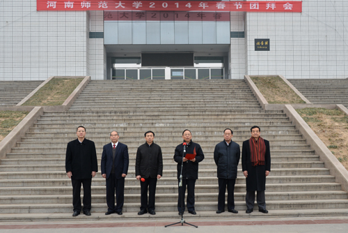 1月31日大年初一,学校图书馆前广场彩旗飘扬,乐曲悠扬,“2014年春节团拜会”在这里举行。校长王键吉,校党委副书记、工会主席王海旺,副校长徐存拴、王新生、杨林、黑建敏,300余名教职工参加了春节团拜会。春节团拜会由王海旺副书记主持。