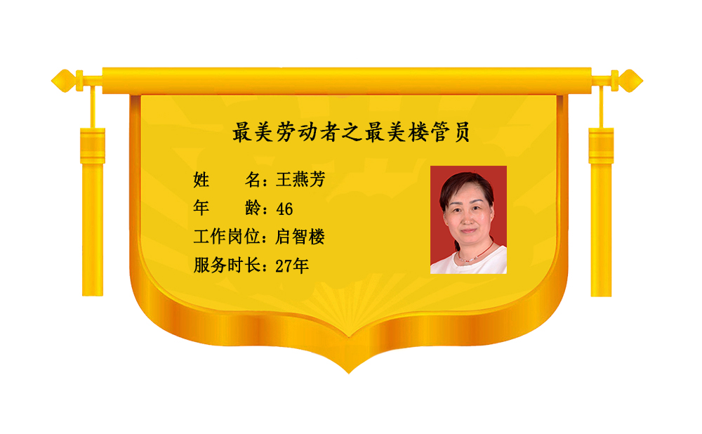 王燕芳自1992年入职以来,始终将“为师生服务,为教学服务”放在第一位,每天检查维护保养楼内各种设施设备,守护着启智楼7000余名师生,积极配合学校各院系组织开展各种大型考试,日复一日、全心全意、孜孜不倦,她在平凡的工作岗位上,默默地奉献着辛勤的汗水和爱心,为广大师生提供舒适的教学与学习环境,多次荣获校先进个人等荣誉称号。