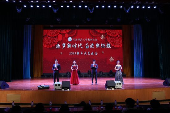 华夏盛世山河秀,春暖新联日月新。12月31日,新联学院“逐梦新时代 奋进新征程”2021新年文艺晚会在多功能报告厅隆重举行。正处级组织员张永胜、金绪泽、段其旺,学院领导李浩、张长伟、朱进、王虎、卢海燕出席晚会。全体教职工、家属和学生代表500余人共同观看演出。