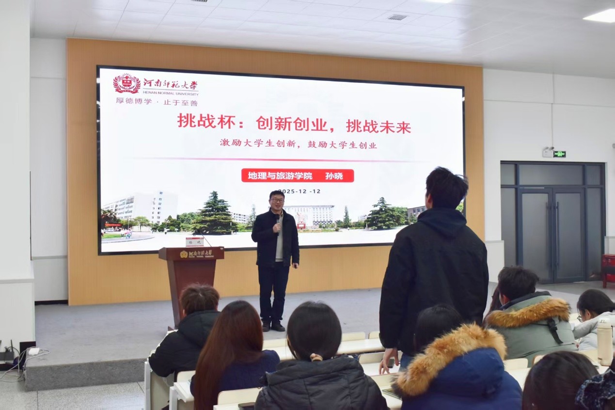 为培养学生创新精神和实践能力,夯实“挑战杯”项目培育基础,提升学生参赛能力,12月12日下午,地理与旅游学院于树蕙堂举办“经纬计划”创新创业训练营专题讲座,学院党委副书记孙晓担任主讲人。学院相关负责人、专兼职辅导员、挑战杯参赛团队指导教师、学生代表230余人参加了本次讲座,讲座由院团委书记张志明主持。