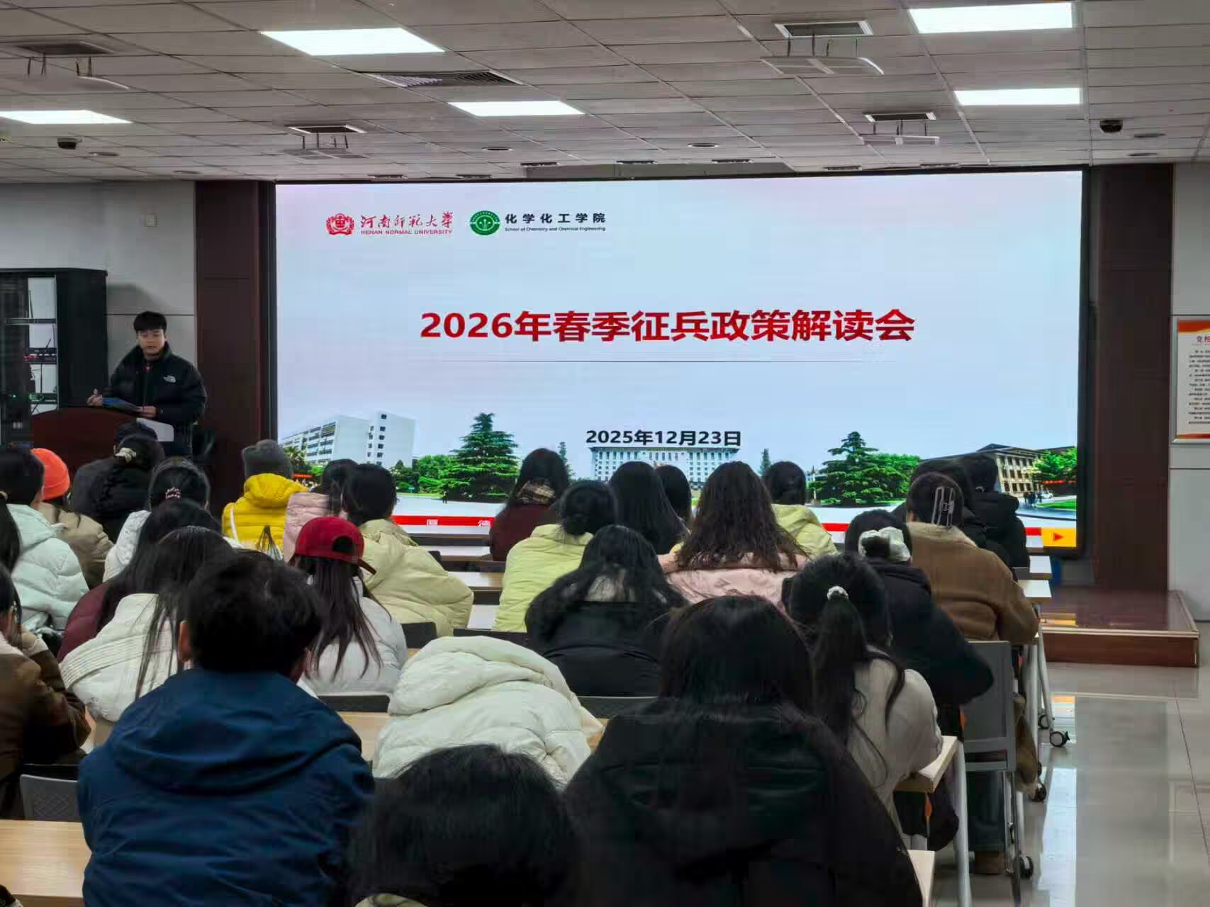 张振楠以“大学生为什么应征入伍”为切入点,从入伍的报名基本条件和流程、注意事项以及优惠政策等多个方面向大家详细解读了大学生应征入伍政策。其中,他重点向应届毕业生介绍了部队发展、考研升学和学费补偿等有关事项。随后,张振楠带领大家回顾了学院近年来征兵工作情况,展示了部分应征入伍学生的军营生活,介绍了学院历届应征退伍学生的个人发展情况,用事实说话,鼓励踊跃投身军营,用自身所学报效祖国。最后,他表示大学生应增强政治责任感,自觉担负起时代所赋予的历史使命,积极响应国家号召,主动携笔从戎,保家卫国。