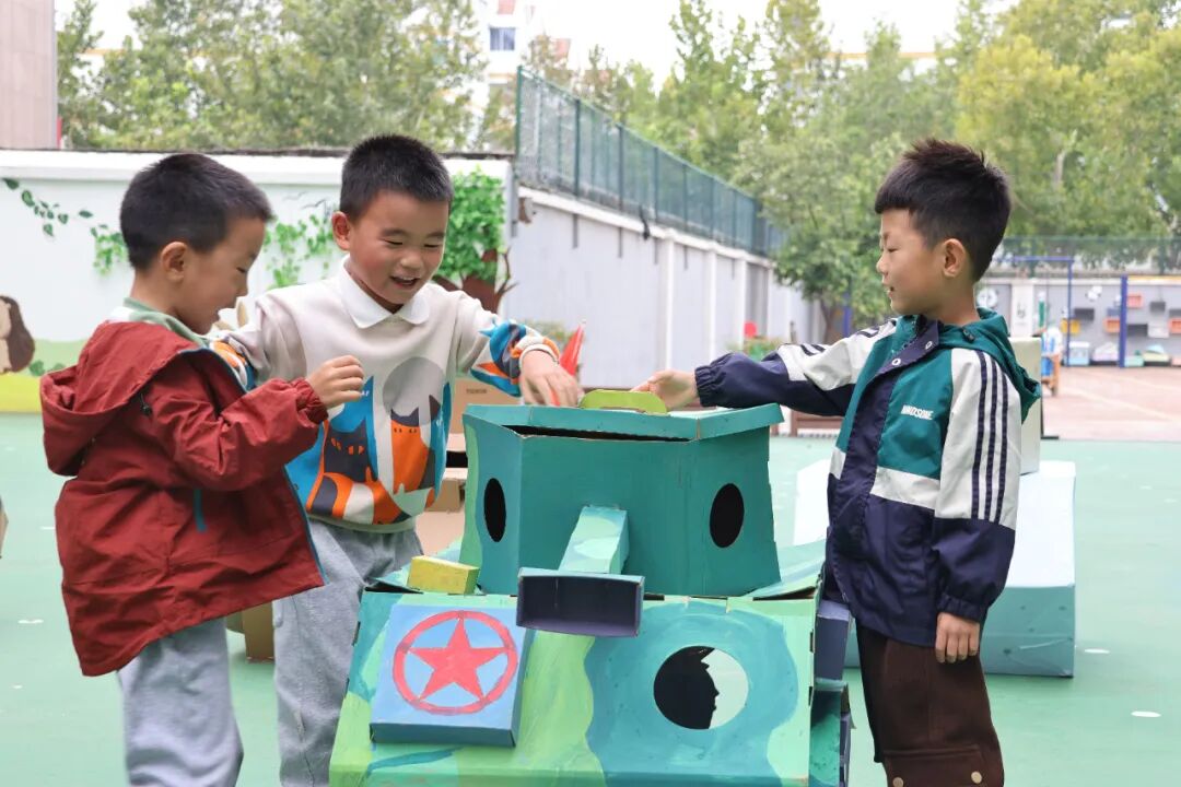 展台前,一件件作品诉说着科技与创意。坦克履带由纸板拼接、飞机机翼藏着齿轮巧思、带着LED灯的小装置闪烁微光。这些是家长与孩子共同完成的作品,大手扶零件,小手绘细节,每件作品,都是创意的绽放,更是陪伴的见证。孩子漫步于展厅中,难以掩盖心中的兴奋,认真地向小伙伴们介绍自己的作品,眼神中闪烁着自信的光芒。“我想坐火箭去太空!”“要让机器人帮助人们解决难题!”......在孩子们童真的话语里,满是对未来科技的憧憬,现场洋溢着快乐的氛围。活动中,邀请中班弟弟妹妹来参观,他们走到自己喜欢的作品前,认真听着哥哥姐姐的精彩讲解,感受着科技的神奇奥秘。当探索与发现成为日常,科学的种子便在孩子们心中悄然生根。每一次探索,都是他们对科学的向往;每一次发现,都是他们成长的见证。