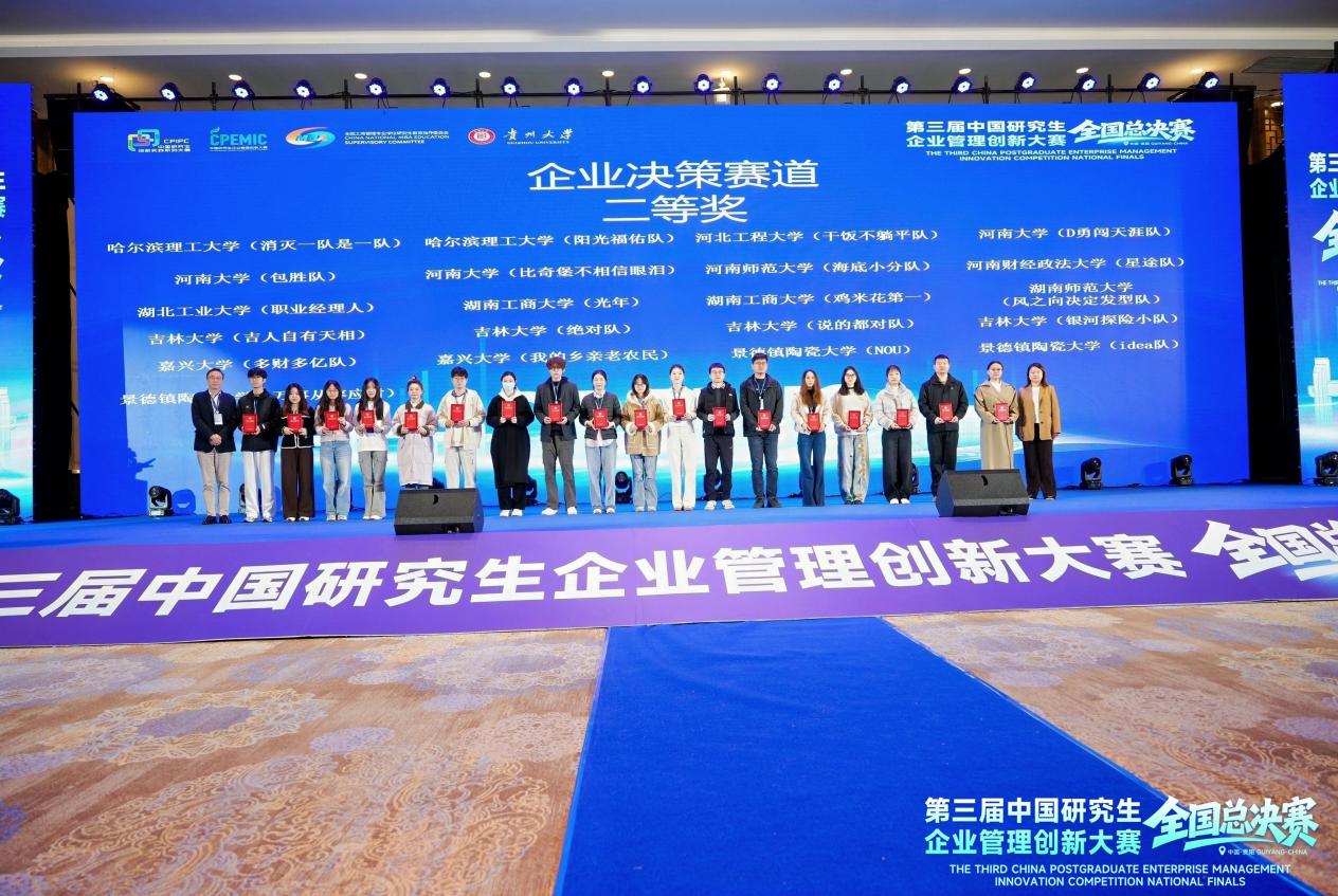 2025年11月9日,由全国工商管理专业学位研究生教育指导委员会秘书处、中国学位与研究生教育学会工商管理专业学位工作委员会、贵州大学承办的第三届中国研究生企业管理创新大赛全国总决赛在贵阳圆满落幕。我校多支研究生团队表现优异,从来自304所高校的2514支参赛队伍中脱颖而出,成功晋级总决赛,并最终斩获佳绩。其中,由赵勇、杨慧慧老师指导,赵成阳、周梦秋、陈雅凝组成的研究生团队荣获全国二等奖;由宋跃刚、陈酉宜老师指导,耿昊擎、宋孟格、赵正豪组成的研究生团队,以及由杨慧慧、蒋丽老师指导,王霄、韩昕润、王道坦组成的研究生团队,分别获得全国三等奖。