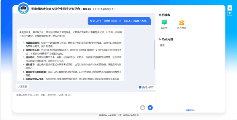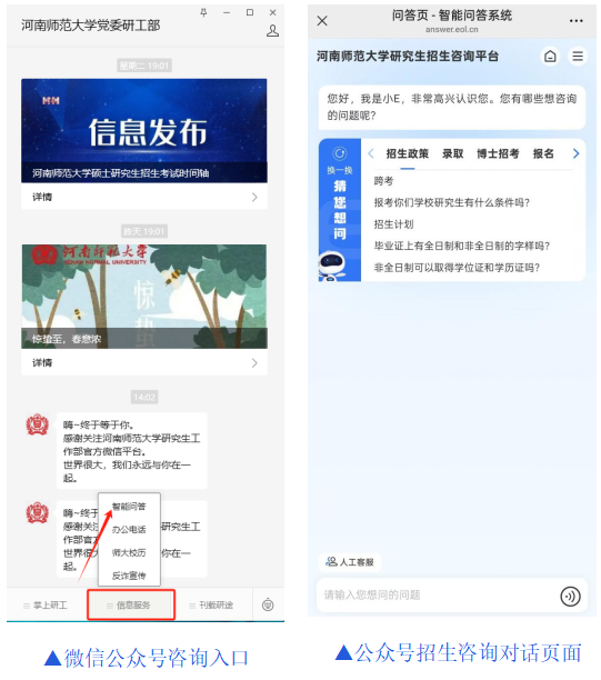 关注后可进入到“党委研工部”微信公众号主页,点击底栏“信息服务”菜单栏的“智能问答”即可在线咨询。公众号招生咨询平台问答页同时支持语音提问。