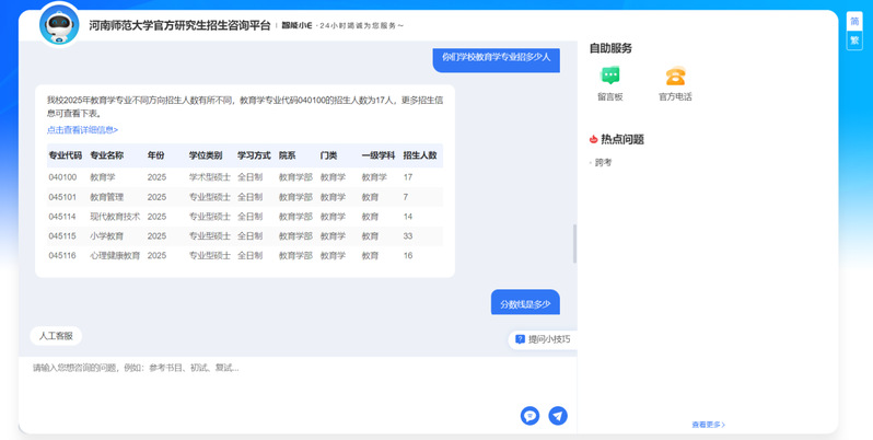 当你问“我报考了你们学校的教育学专业,初试考了310分,能进你们学校的复试吗”时,系统不仅能通过DeepSeek大模型技术精准识别你的咨询意图是:专业、复试录取分数,还会结合历年录取数据,为你提供更有参考性的回复!
