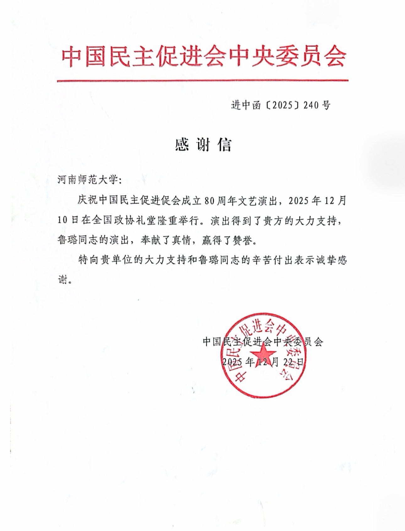 信中指出,此次文艺演出得到我校的大力支持,鲁璐同志的演出奉献了真情,赢得了赞誉。鲁璐凭借其深厚的专业素养与丰富的舞台经验,承担了演出相关的重要工作,以严谨的职业态度和精湛的艺术表现,为活动提供了扎实的专业支持。作为长期深耕于音乐舞蹈教学、创作与舞台实践的教师,她将专业所长融入重大庆典演出,是以实际行动服务社会文化建设的生动体现,彰显了我校教师立足专业、奉献社会的担当精神。
