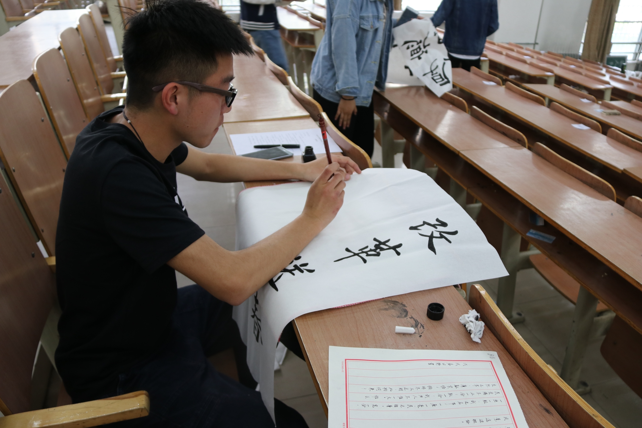 活动伴着一曲悦耳的古筝开始,参赛选手闻着墨香、伴着乐声认真书写,自由发挥。参赛选手沉着冷静,神情专注,坐姿端正,严格遵守赛场纪律。此次比赛分为毛笔、粉笔、钢笔书写三个项目,所有参赛作品均围绕改革主题展开。其中,在粉笔书写项目中,2017级城市管理专业的刘文鑫用端正的楷体书写了“迎春风、颂改革”六个大字,表达了对祖国改革开放四十周年的感叹。其中不乏字迹娟秀的作品,2016级思想政治教育专业的郝慧中以隽永字体展现了新时代大学生昂扬的精神风貌。比赛中,美术学院评委就书写给予选手相关建议与指导。随后研究生代表殷永兵对本次比赛进行点评,他在肯定选手们书法水平的同时,又针对不同书写方式对参赛选手提出建议,他希望选手们在加强书法能力的同时,多领略书法魅力,增加自己的人文情怀。比赛结束后,各类参赛作品根据不同书写标准进行评比,本次比赛共评选出单项奖与全能奖一等奖三名、二等奖五名、三等奖七名。
