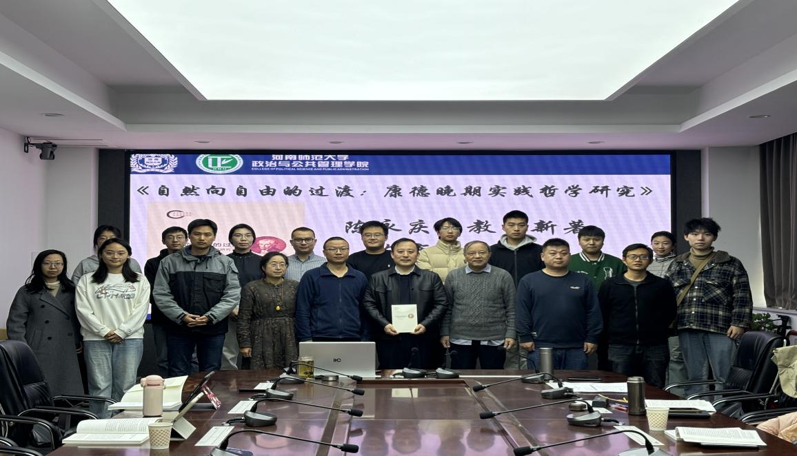 首先由韩万渠致辞。他高度肯定专著类学术成果对学院学科建设与专业发展的重要意义,鼓励学院青年教师积极整理博士论文并出版。其次,陈永庆系统介绍新著的研究动机、核心议题与理论突破,该书以康德晚期实践哲学为核心,重构其哲学体系的整体性,重新阐释“自然向自由过渡”的关键问题。最后李耀南、王海琴、李超瑞三位老师分别从康德法权学说、《判断力批判》与实践哲学的衔接等角度展开评议交流,探讨康德道德人类学与历史哲学的内在关联等关键议题,深化了大家对康德哲学体系性问题的理解。