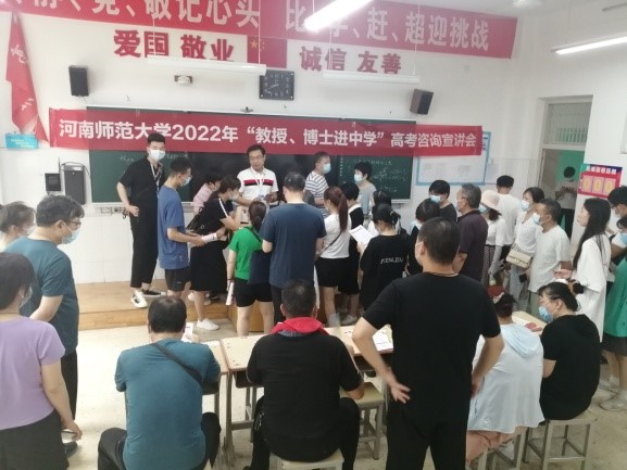社会事业学院高度重视招生宣传工作,为了做好此项工作,学院成立招生宣传工作领导小组,书记、院长任组长,全体班子成员任副组长,分工合作,并划拨专项经费,组织全院师生对我院目标中学及全省部分重点高中积极开展招生宣传工作。6月26日,学院党委书记瞿洪明通过“高招通”,线上为3000多名考生和家长讲解今年高招政策、志愿填报技巧,宣传师大雄厚办学实力和良好的学风,介绍师大优势学科和特色专业,并为在线考生答疑解问,收到了良好的效果。6月27—28日,学院接到目标中学的热情邀请,由书记瞿洪明、院长魏雷东、副书记林安春、副院长海龙带队,分赴宜阳一高、河科大附中、洛阳理工附中、栾川一高等地开展实地招生宣传,受到了当地考生和家长的热烈欢迎,纷纷表示组织的“教授、博士进中学”宣讲团是他们遇到的最好的、最有收获的、对考生最有帮助的招生宣传团队。同时,学院团委精密组织、认真制定方案,将暑假大学生社会实践和“我为师大代言”招生宣传活动紧密结合,发动全院近300名暑期返乡大学生通过亲身经历,向家乡考生和高中母校介绍和宣传师大优良的教风学风、优越的办学条件、优美的校园环境,吸引高分考生报考师大、报考社院。