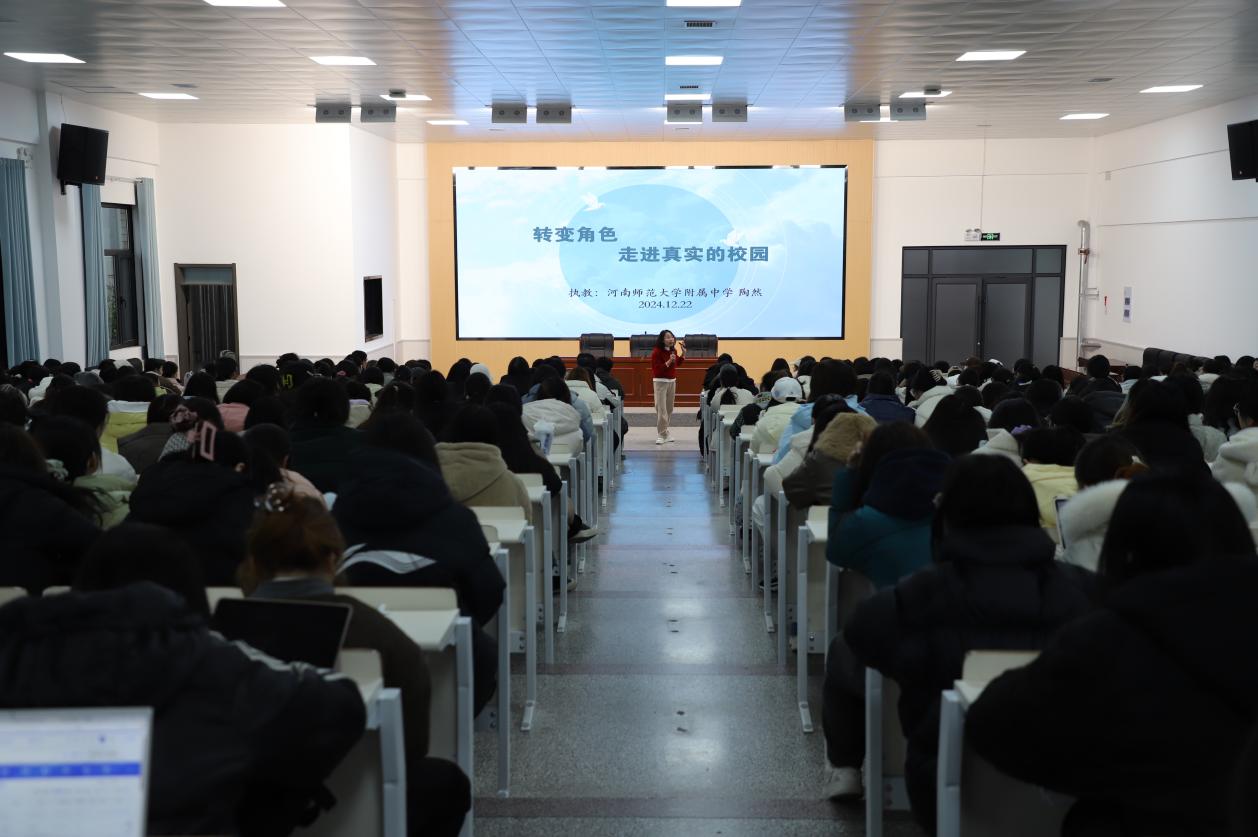 为充分调动学生实习积极性,更好地了解教育实践的内容安排和注意事项,12月22日下午,文学院在万人餐厅三楼树蕙堂举办2022级师范生教育实践专题报告会,邀请附属中学教师、河南省教学名师陶然作题为《转变角色 走进真实的校园》的专题讲座。文学院副院长周惠、2022级辅导员陈光裕以及2022级全体师范生参加此次活动。